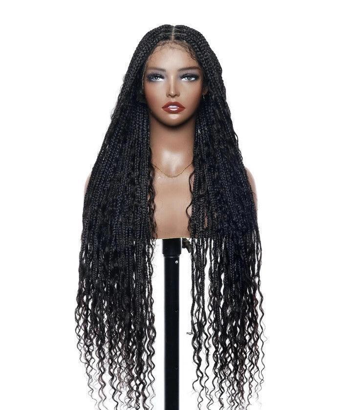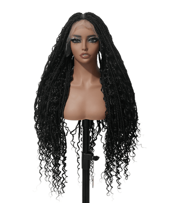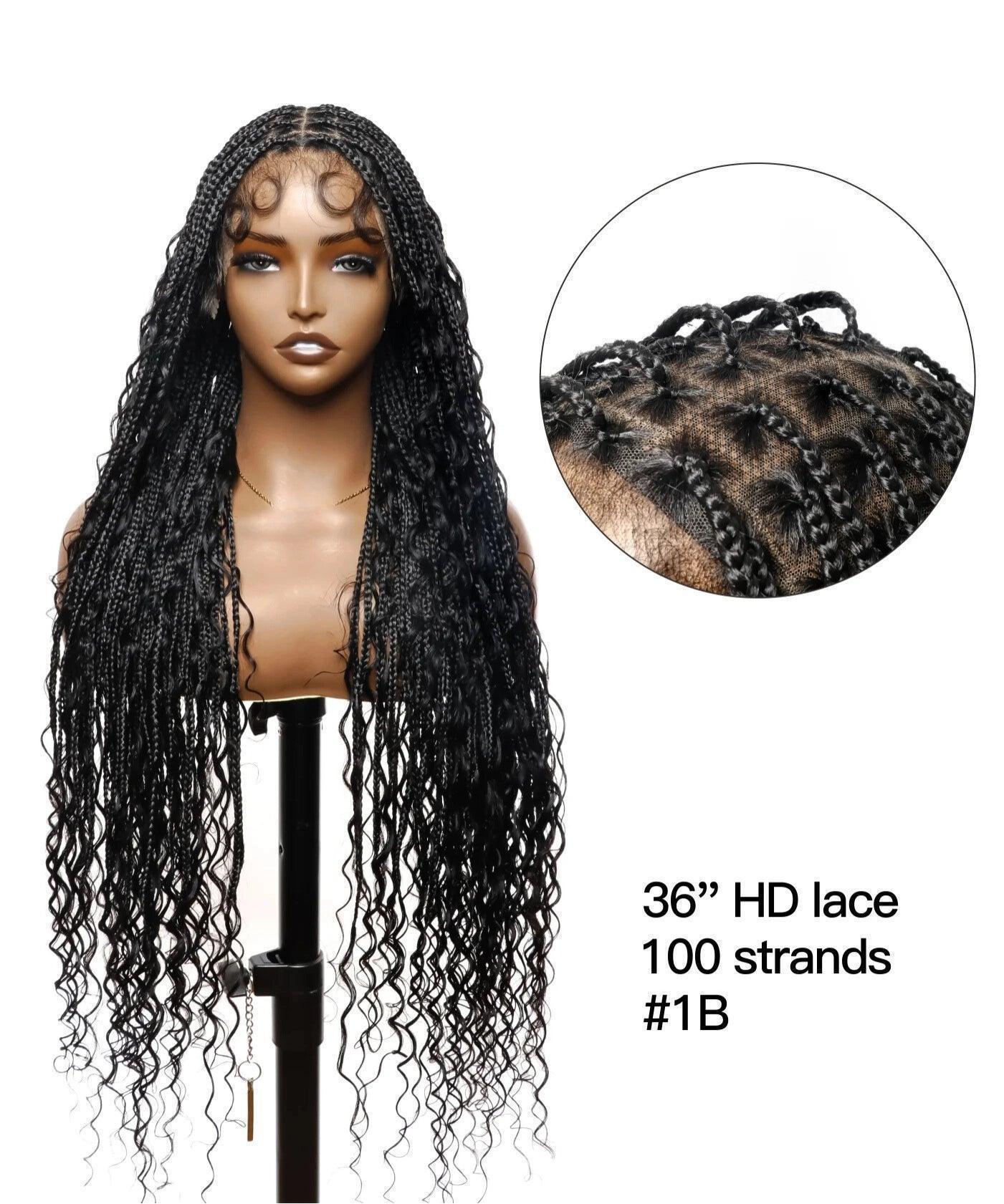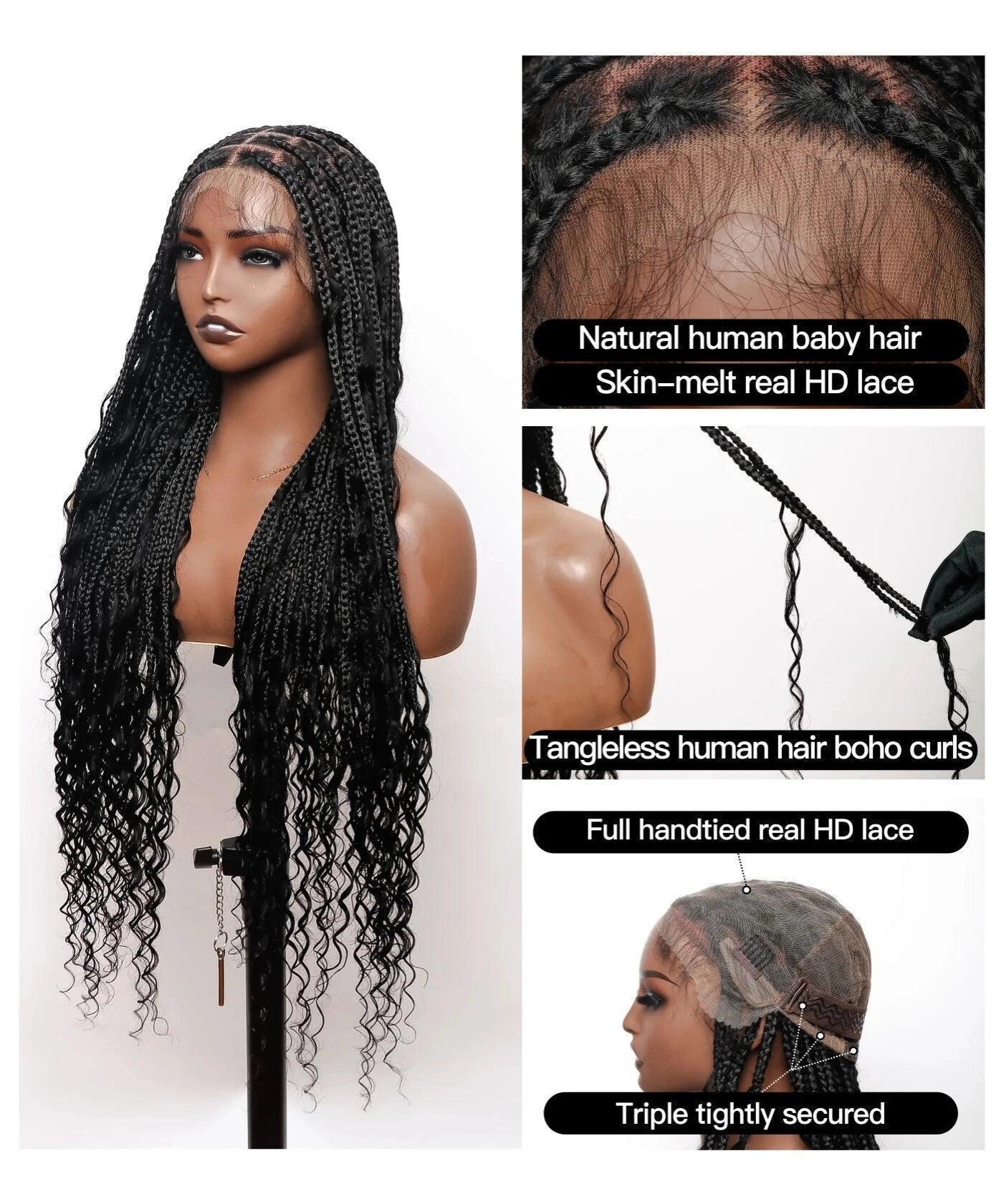 121 Strands Human Baby Hair Boho Curls Knotless Braided HD Full Lace Wig Hand-tied Natural Black